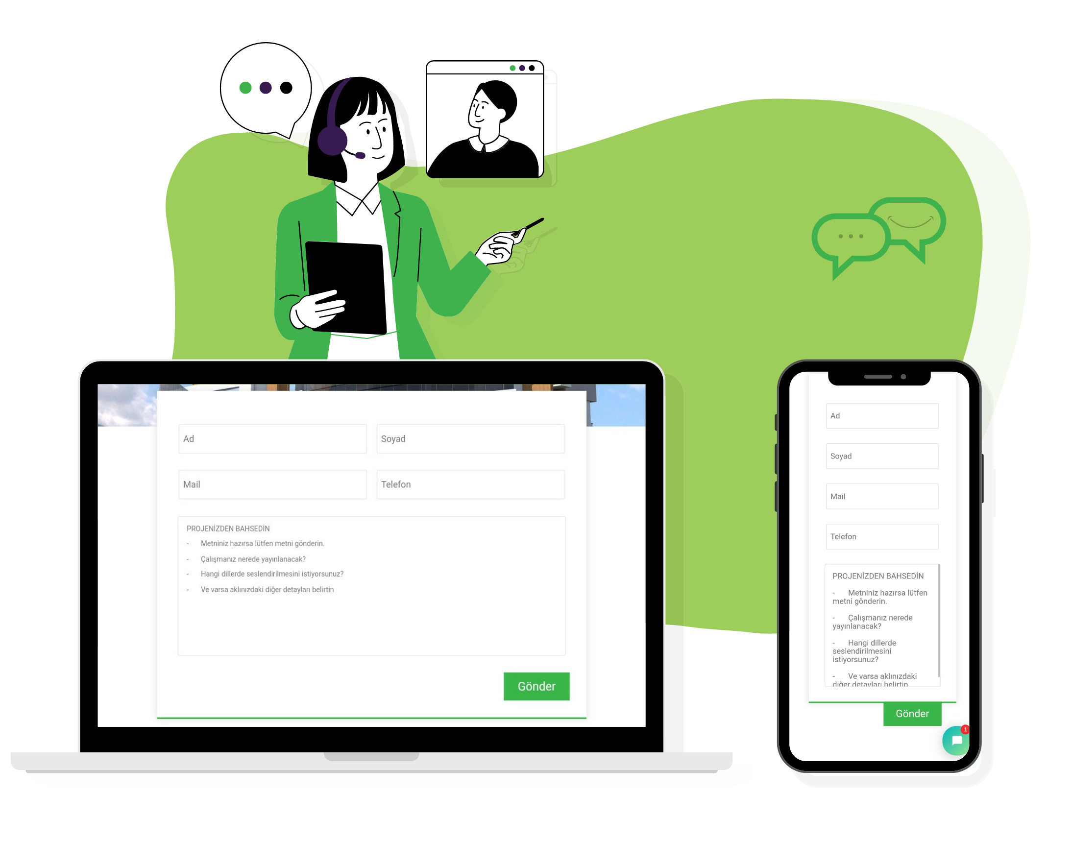 İletişime geçin ve seslendirmesini yaptırmak istediğiniz metin hakkında bizi bilgilendirin. Ekibimiz anında size cevap verecektir.